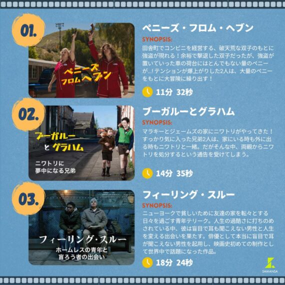 3つの短編映画を1回として『①17:00』『②18:00』『③19:00』の3回の上映を行います。